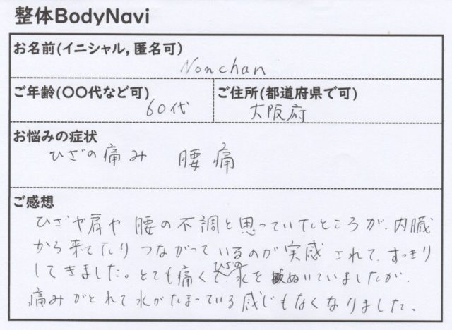 2019.05.08 お客様の声 ひざ痛1 名前 :Nonchanさま年齢 :60歳代住所 :大阪府 お悩みの症状は・腰痛・ひざ痛・ひざの水の溜まり 長年、ひざ痛と腰痛、肩痛でお悩みで大阪からご来店されました病院や整体、鍼灸、マッサージに行っても長年、お悩みが解決しませんでした施術後は、緊張していた腹部や内臓が緩みひざ痛と腰痛が無くなりましたまた、施術直後からひざ関節の水の溜まりが無くなっていくのも実感されました PDF